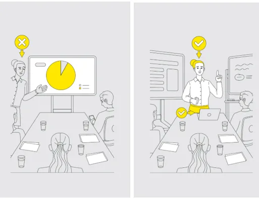 There’s a long rectangular table with chairs around it. At prime position at the head of the table is a giant screen – dominating the spot where a presenter should be. Most screen positions push the presenter off to the side. One guess what this tells an audience about where the most important information is going to be coming from…