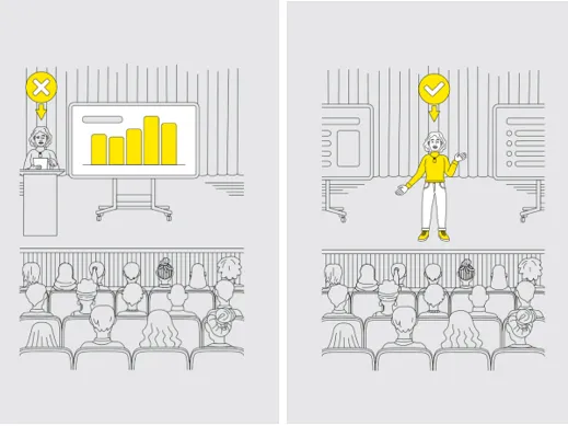 Think about the physical spaces in which you’re presenting – the boardroom or training rooms. In my experience, most are biased toward displays of slides rather than human connection.